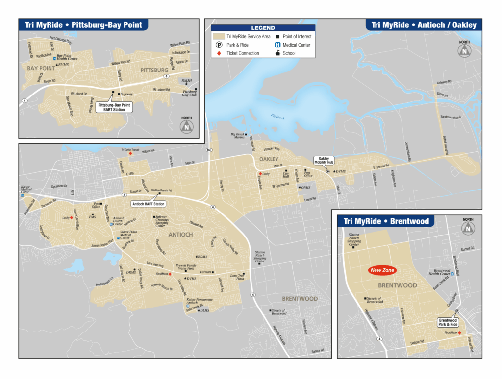Microtransit will pick up and drop off riders anywhere within the single designated service area. Our current service areas are Pittsburg/Bay Point and Antioch/Oakley. You can travel within the individual areas, but not between them. Don’t forget that Tri MyRide can connect you to fixed route lines, BART and Amtrak.