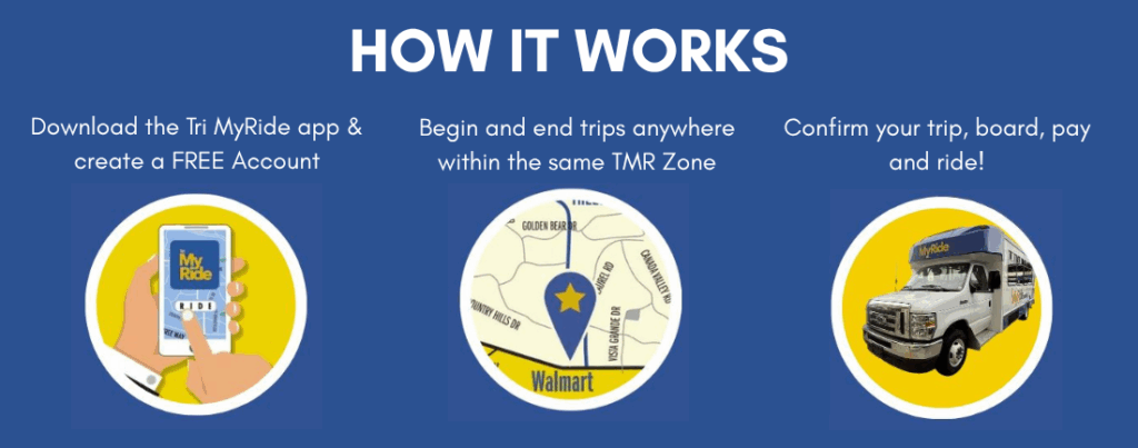 Tri MyRide is an on-demand, corner-to-corner, shared shuttle service. Take trips that start and end anywhere within the individual service area. Scroll down for more information.