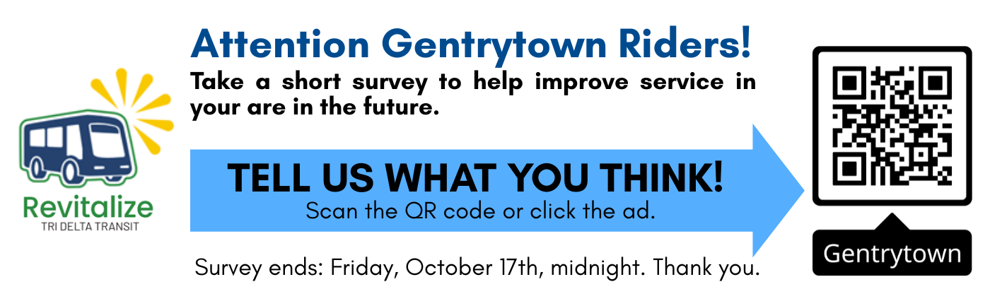Tri Delta Transit is releasing a few surveys for rider feedback on our new system. This survey is for Gentrytown riders to gauge where travelers are starting from and where they are going to from this area throughout our service area. This may be used for future planning purposes.